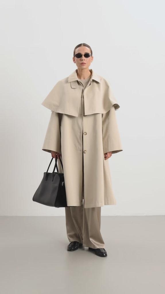 Loano Trenchcoat is a modern interpretation of a timeless classic, designed with a detachable cape that adds movement and architectural elegance to the silhouette. The cape is fastened with discreet buttons hidden under the collar and can be removed to reveal a clean, classic trench coat — offering two distinct looks in one refined design. The trench features a distinctive neck closure that can be worn open or fastened for a more sculptural expression, perfect for styling across seasons.
